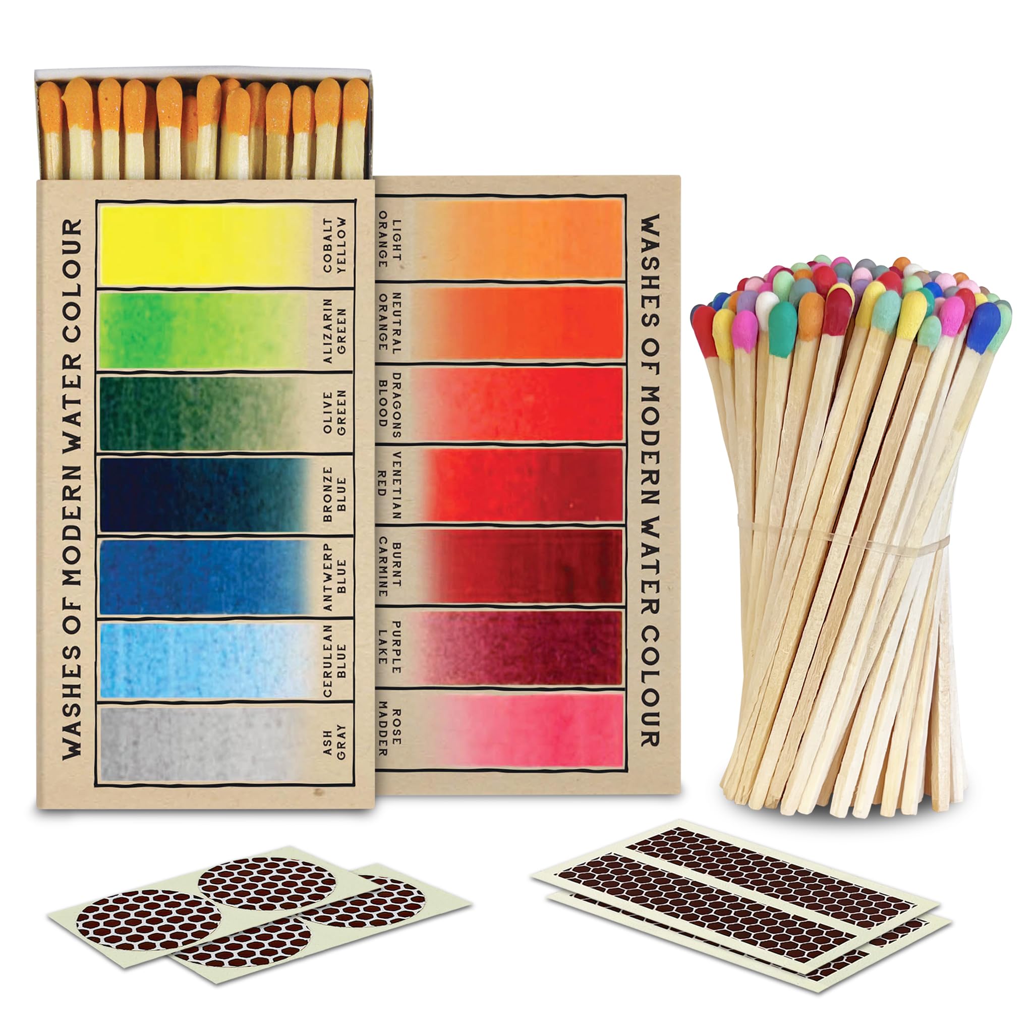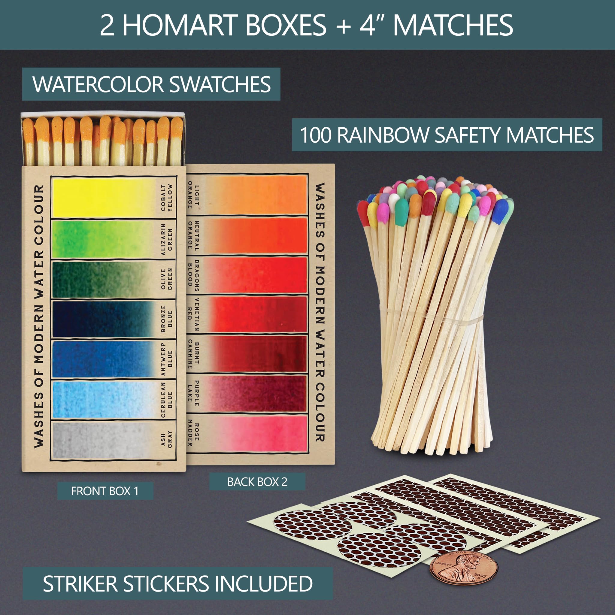 ABOUT 4” RAINBOW COLORED MATCHES + 2 BOXES DESIGNER BOXES + STRIKERS INCLUDED