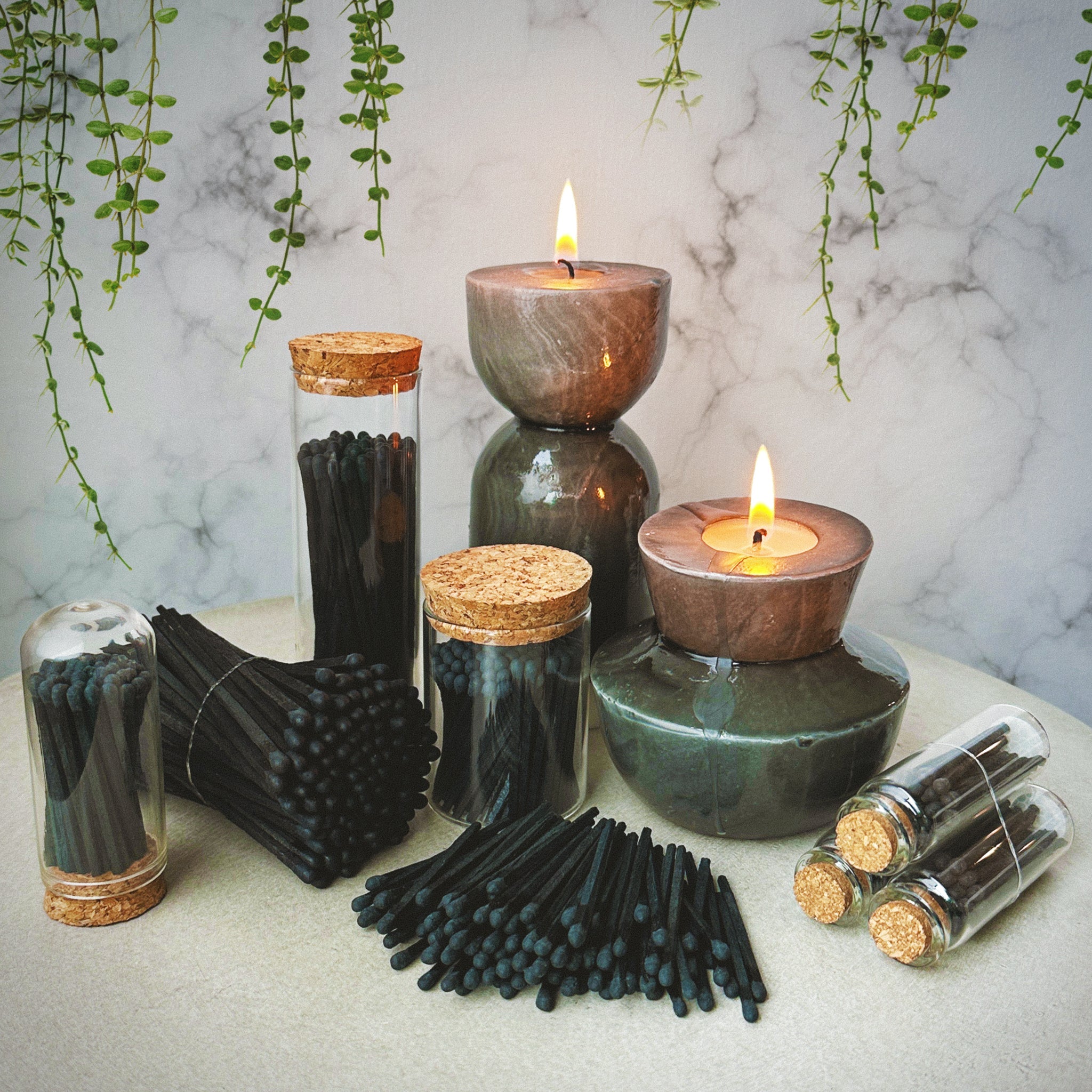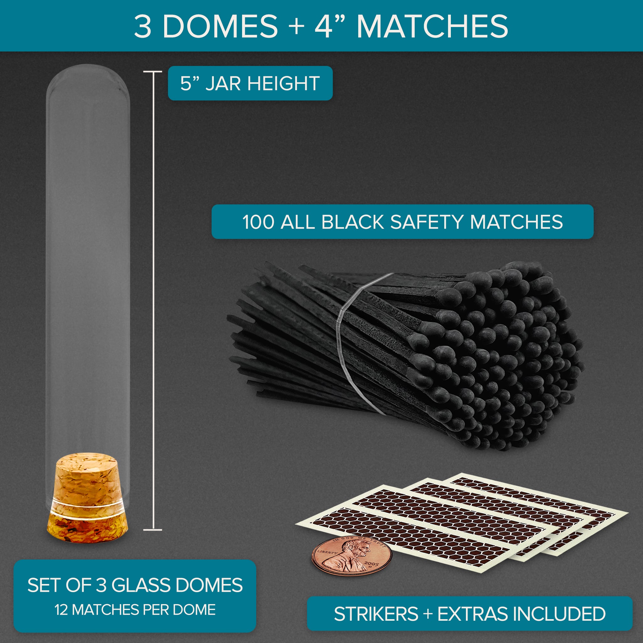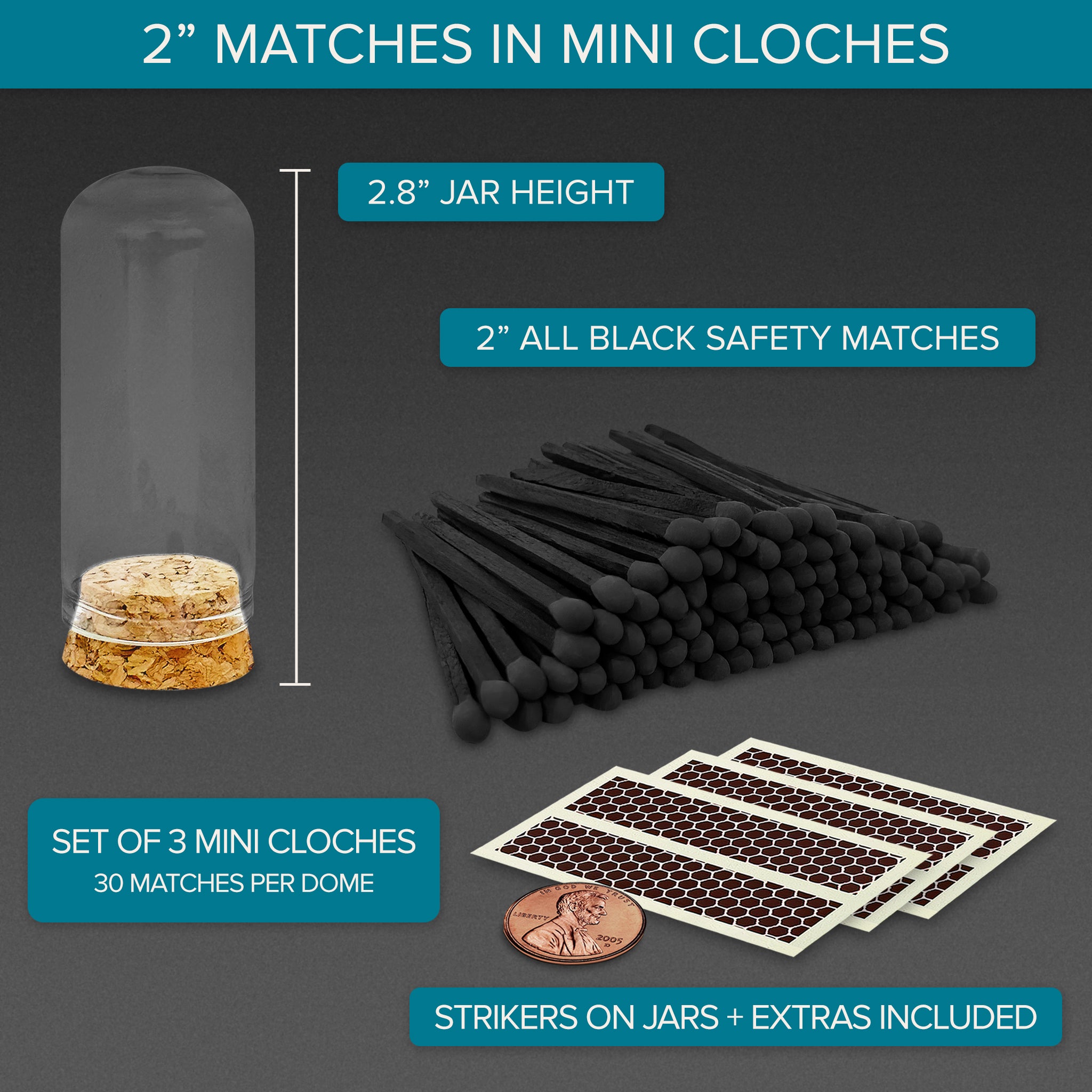 2” All Black Safety Matches in 3 Mini Cloches