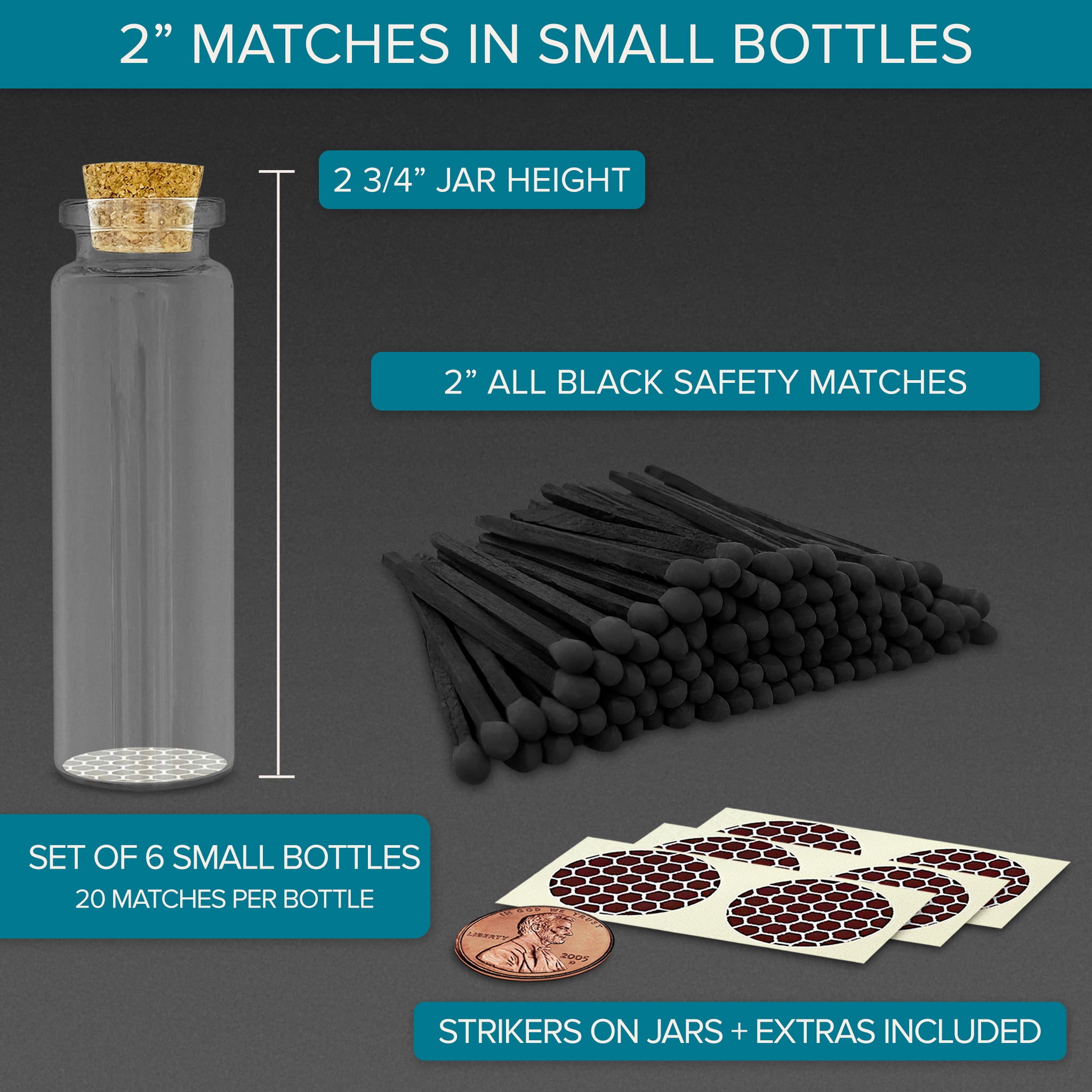 2” All Black Safety Matches in 6 Small Bottles