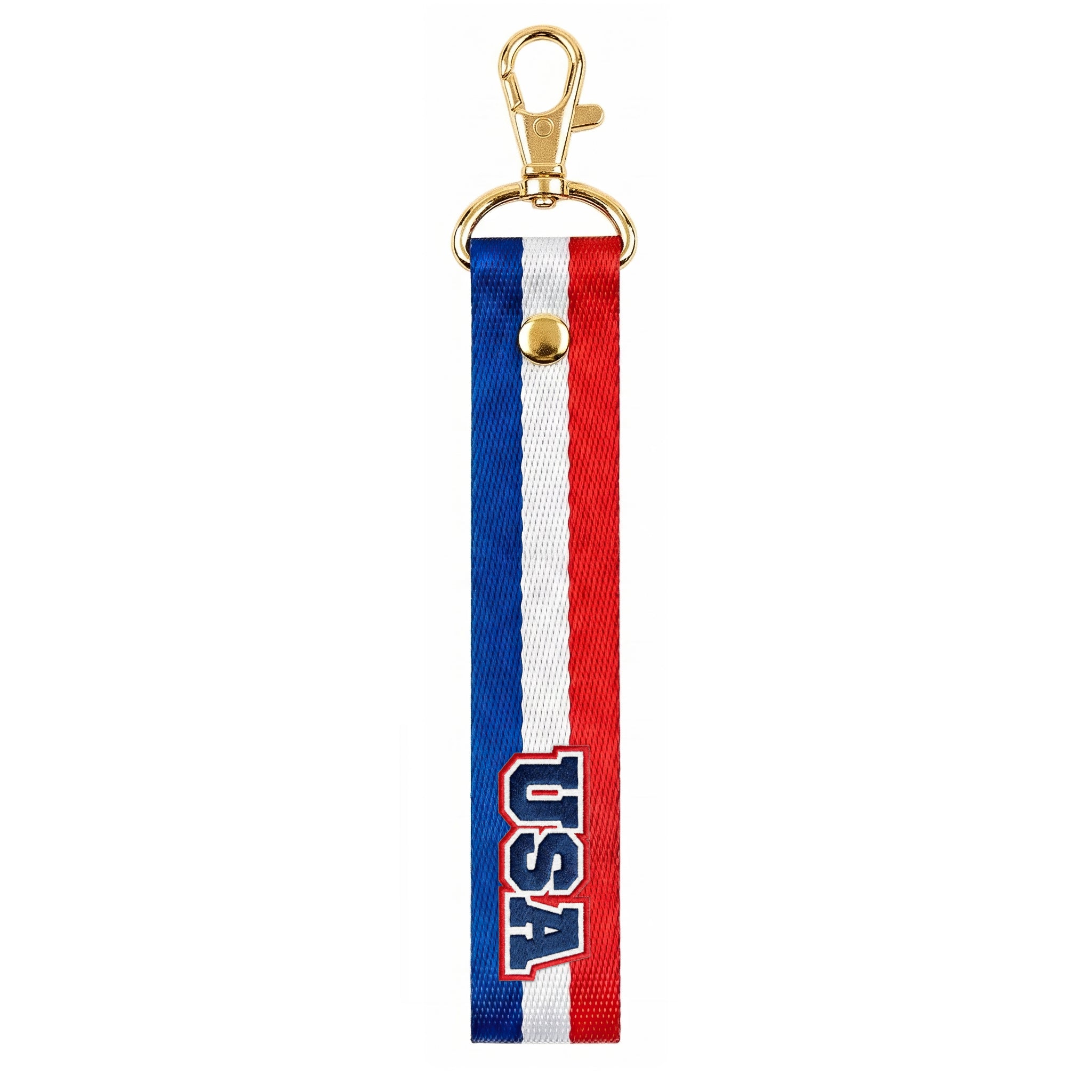 •  Durable woven wristlet with red, white, and blue striping