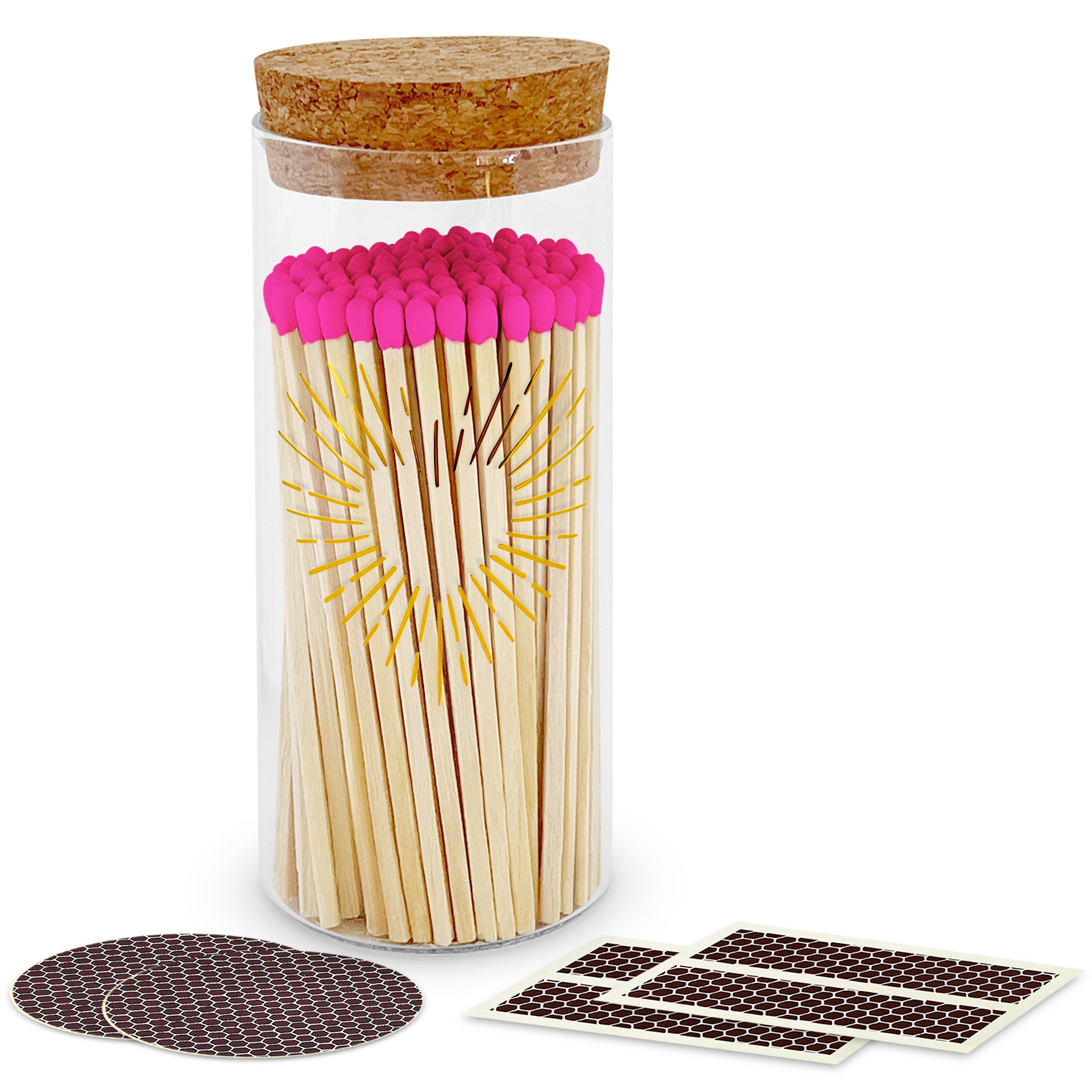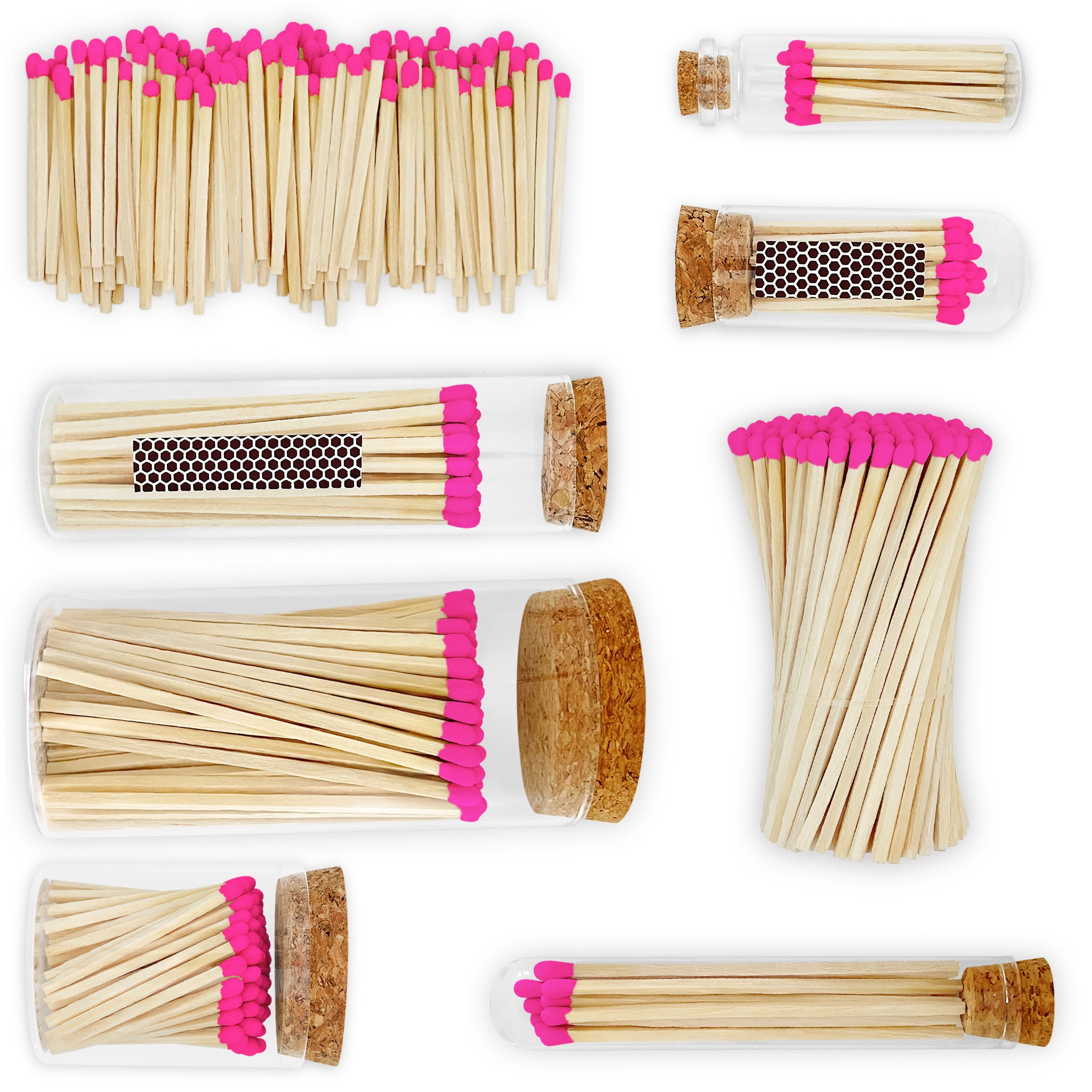 Barbie colored tip matches with natural wood sticks are definitely having their moment. Bright and fun, they are an ideal pop of color for your event, home or seasonal decor.