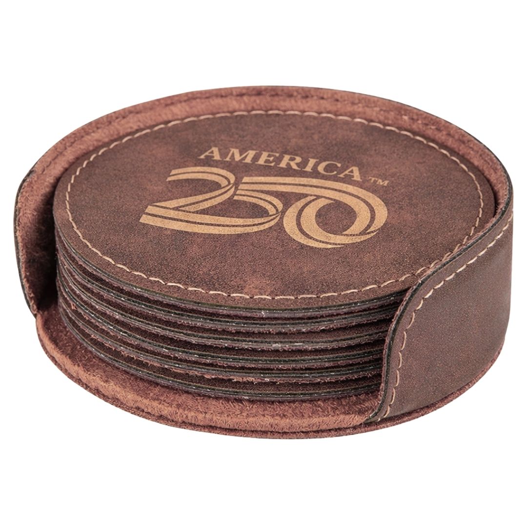 Designed for everyday use and meaningful moments, this set of six leatherette coasters commemorates America’s 250th anniversary with iconic, officially licensed artwork. Each round coaster features clean, bold designs that celebrate history while fitting seamlessly into modern spaces.